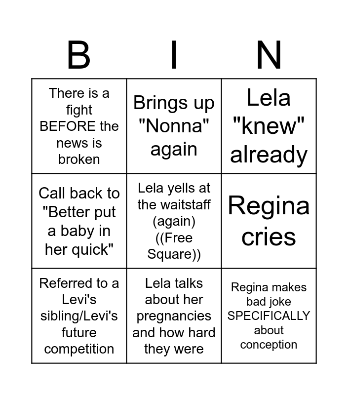 This bingo card has a free space and 8 words: Regina cries, Lela "knew" already, Brings up "Nonna" again, Referred to a Levi's sibling/Levi's future competition, There is a fight BEFORE the news is broken, Regina makes bad joke SPECIFICALLY about conception, Call back to "Better put a baby in her quick" and Lela talks about her pregnancies and how hard they were.