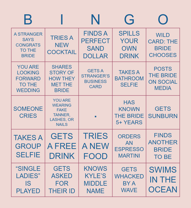 This bingo card has a free space and 24 words: GETS A FREE DRINK, GETS ASKED FOR THEIR ID, GETS A STRANGER’S BUSINESS CARD, “SINGLE LADIES” IS PLAYED, WILD CARD: THE BRIDE CHOOSES, A STRANGER SAYS CONGRATS TO THE BRIDE, YOU ARE LOOKING FORWARD TO THE WEDDING, TRIES A NEW COCKTAIL, HAS KNOWN THE BRIDE 5+ YEARS, TRIES A NEW FOOD, TAKES A BATHROOM SELFIE, SOMEONE CRIES, ORDERS AN ESPRESSO MARTINI, FINDS ANOTHER BRIDE TO BE, SHARES STORY OF HOW THEY MET THE BRIDE, GETS WHACKED BY A WAVE, GETS SUNBURN, FINDS A PERFECT SAND DOLLAR, POSTS THE BRIDE ON SOCIAL MEDIA, YOU ARE WEARING FAKE TANNER, LASHES, OR NAILS, SWIMS IN THE OCEAN, TAKES A GROUP SELFIE, SPILLS YOUR OWN DRINK and KNOWS KYLE’S MIDDLE NAME.
