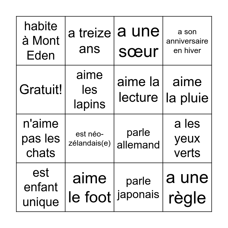 This bingo card has 16 words: aime le foot, a les yeux verts, a une sœur, habite à Mont Eden, n'aime pas les chats, a treize ans, parle allemand, parle japonais, Gratuit!, aime les lapins, est enfant unique, a son anniversaire en hiver, est néo-zélandais(e), aime la pluie, aime la lecture and a une règle.