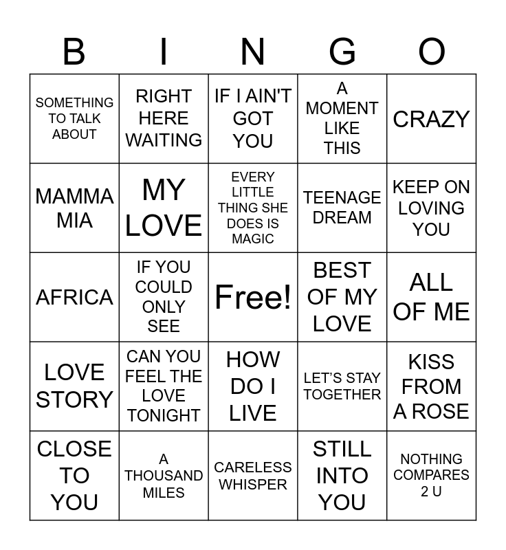 This bingo card has a free space and 24 words: CAN YOU FEEL THE LOVE TONIGHT, A THOUSAND MILES, EVERY LITTLE THING SHE DOES IS MAGIC, CLOSE TO YOU, CRAZY, SOMETHING TO TALK ABOUT, MAMMA MIA, RIGHT HERE WAITING, BEST OF MY LOVE, HOW DO I LIVE, TEENAGE DREAM, AFRICA, LET’S STAY TOGETHER, KISS FROM A ROSE, MY LOVE, STILL INTO YOU, ALL OF ME, IF I AIN'T GOT YOU, KEEP ON LOVING YOU, IF YOU COULD ONLY SEE, NOTHING COMPARES 2 U, LOVE STORY, A MOMENT LIKE THIS and CARELESS WHISPER.