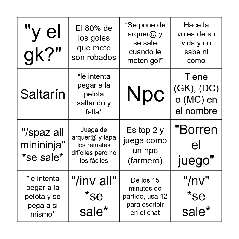 This bingo card has 16 words: "/inv all" *se sale*, "Borren el juego", *Se pone de arquer@ y se sale cuando le meten gol*, "y el gk?", "/spaz all minininja" *se sale*, El 80% de los goles que mete son robados, Es top 2 y juega como un npc (farmero), De los 15 minutos de partido, usa 12 para escribir en el chat, Saltarín, *le intenta pegar a la pelota saltando y falla*, *le intenta pegar a la pelota y se pega a si mismo*, Hace la volea de su vida y no sabe ni como, Juega de arquer@ y tapa los remates difíciles pero no los fáciles, Tiene (GK), (DC) o (MC) en el nombre, Npc and "/nv" *se sale*.