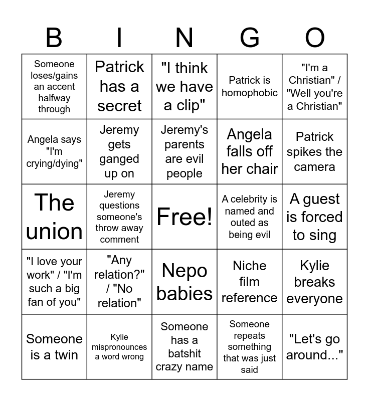 This bingo card has a free space and 24 words: "Any relation?" / "No relation", Kylie mispronounces a word wrong, Jeremy's parents are evil people, Someone is a twin, "I'm a Christian" / "Well you're a Christian", Someone loses/gains an accent halfway through, Angela says "I'm crying/dying", Patrick has a secret, A celebrity is named and outed as being evil, Nepo babies, Angela falls off her chair, The union, Niche film reference, Kylie breaks everyone, Jeremy gets ganged up on, Someone repeats something that was just said, A guest is forced to sing, "I think we have a clip", Patrick spikes the camera, Jeremy questions someone's throw away comment, "Let's go around...", "I love your work" / "I'm such a big fan of you", Patrick is homophobic and Someone has a batshit crazy name.
