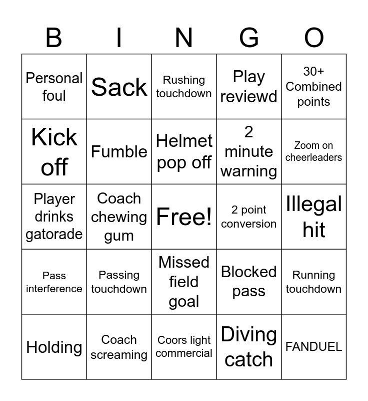 This bingo card has a free space and 44 words: One handed catch, FANDUEL, Play challenged, Holding, Drunk fan, Diving catch, Rushing touchdown, Fan with face paint, 30+ Combined points, Coach screaming, Play reviewd, 2 point conversion, Missed field goal, Passing touchdown, Touchdown dance, Coors light commercial, Field goal, Player drinks gatorade, Interception, Zoom on cheerleaders, Sack, Off sides, False start, Personal foul, Injury/time out, Illegal hit, Budweiser ad, Shot of bummed fan, Blocked pass, Pass interference, Coach yells at referee, Running touchdown, Taylor Swift sighting, Challenge, Coach chewing gum, Aerial view of stadium, Delay of game, QB blitz, Helmet pop off, Kick off, 2 minute warning, Over 20 years rush, Fumble and Over 20 years catch.