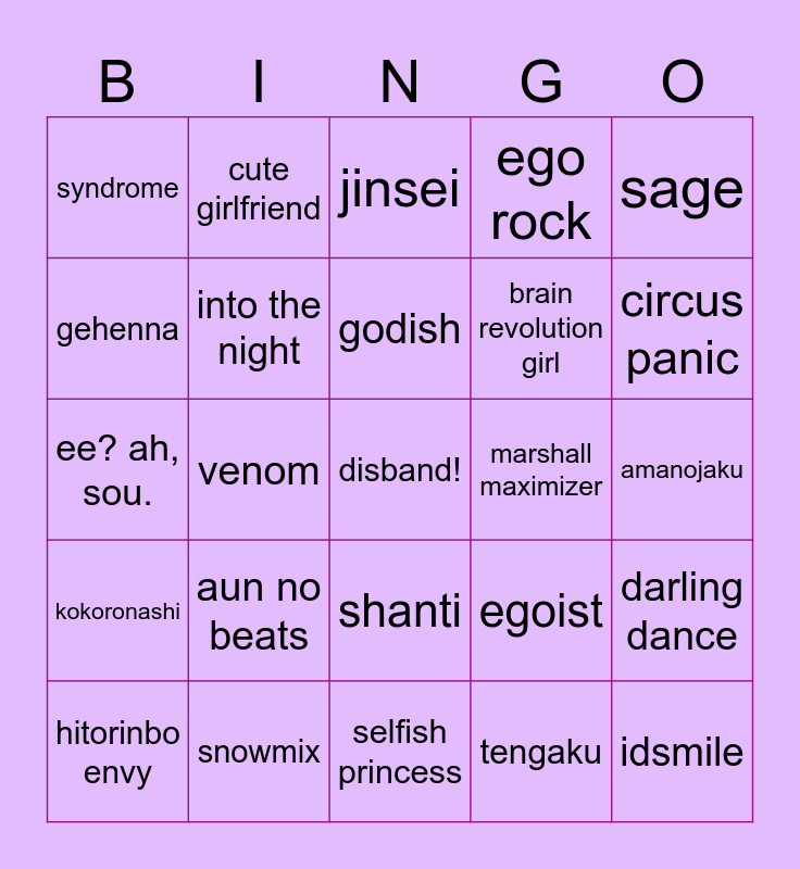 This bingo card has a free space and 24 words: aun no beats, snowmix, godish, hitorinbo envy, sage, syndrome, gehenna, cute girlfriend, marshall maximizer, shanti, brain revolution girl, ee? ah, sou., egoist, darling dance, into the night, tengaku, amanojaku, jinsei, circus panic, venom, idsmile, kokoronashi, ego rock and selfish princess.