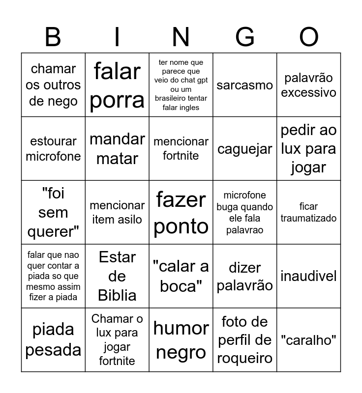 This bingo card has a free space and 24 words: Estar de Biblia, Chamar o lux para jogar fortnite, mencionar fortnite, piada pesada, palavrão excessivo, chamar os outros de nego, estourar microfone, falar porra, microfone buga quando ele fala palavrao, "calar a boca", caguejar, "foi sem querer", dizer palavrão, inaudivel, mandar matar, foto de perfil de roqueiro, ficar traumatizado, ter nome que parece que veio do chat gpt ou um brasileiro tentar falar ingles, pedir ao lux para jogar, mencionar item asilo, "caralho", falar que nao quer contar a piada so que mesmo assim fizer a piada, sarcasmo and humor negro.