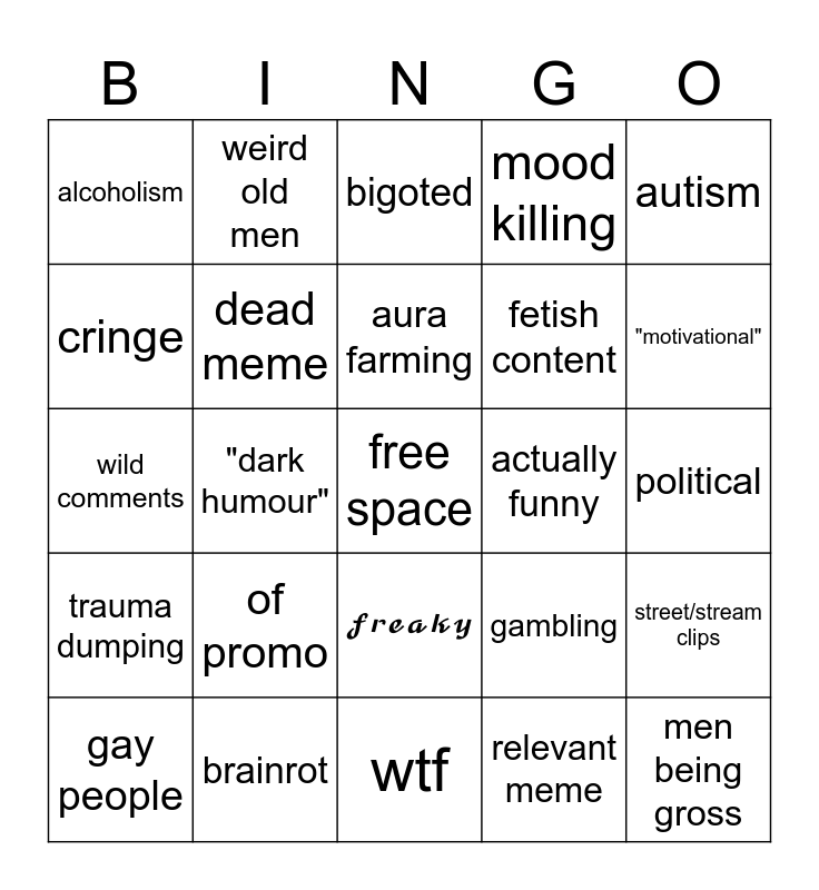 This bingo card has a free space and 24 words: of promo, brainrot, aura farming, gay people, autism, alcoholism, cringe, weird old men, actually funny, 𝓯𝓻𝓮𝓪𝓴𝔂, fetish content, wild comments, gambling, street/stream clips, dead meme, relevant meme, political, bigoted, "motivational", "dark humour", men being gross, trauma dumping, mood killing and wtf.