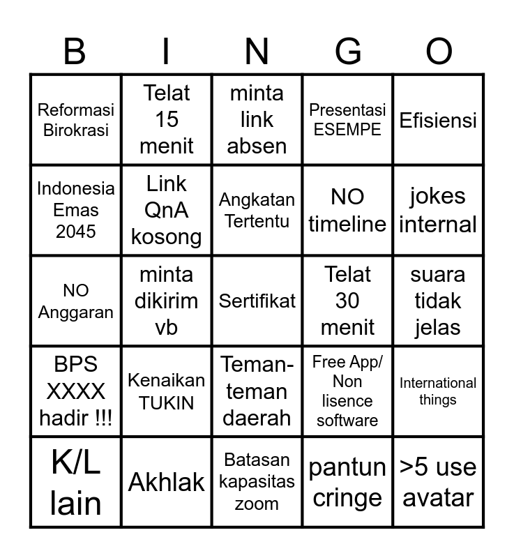 This bingo card has a free space and 24 words: Kenaikan TUKIN, Akhlak, Angkatan Tertentu, K/L lain, Efisiensi, Reformasi Birokrasi, Indonesia Emas 2045, Telat 15 menit, Telat 30 menit, Teman-teman daerah, NO timeline, NO Anggaran, Free App/ Non lisence software, International things, Link QnA kosong, pantun cringe, suara tidak jelas, minta link absen, jokes internal, minta dikirim vb, >5 use avatar, BPS XXXX hadir !!!, Presentasi ESEMPE and Batasan kapasitas zoom.