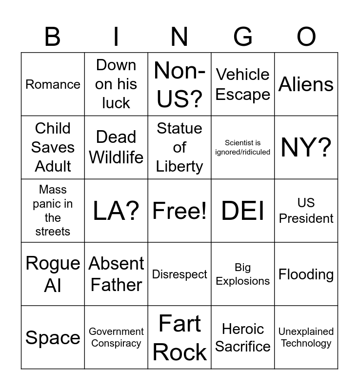 This bingo card has a free space and 24 words: Absent Father, Government Conspiracy, Statue of Liberty, Space, Aliens, Romance, Child Saves Adult, Down on his luck, DEI, Disrespect, Scientist is ignored/ridiculed, Mass panic in the streets, Big Explosions, Flooding, Dead Wildlife, Heroic Sacrifice, US President, Non-US?, NY?, LA?, Unexplained Technology, Rogue AI, Vehicle Escape and Fart Rock.