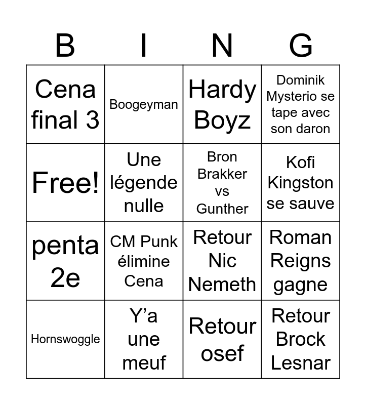 This bingo card has 16 words: Y’a une meuf, Roman Reigns gagne, Hardy Boyz, Cena final 3, penta 2e, Boogeyman, Retour Nic Nemeth, Retour osef, Free!, Une légende nulle, Hornswoggle, Dominik Mysterio se tape avec son daron, CM Punk élimine Cena, Kofi Kingston se sauve, Bron Brakker vs Gunther and Retour Brock Lesnar.