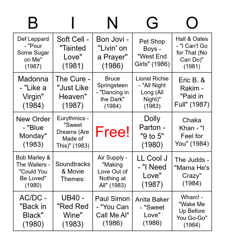 This bingo card has a free space and 76 words: Michael Jackson - "Thriller" (1982), Queen - "Another One Bites the Dust" (1980), Bon Jovi - "Livin' on a Prayer" (1986), Whitney Houston - "I Wanna Dance with Somebody" (1987), Prince - "Purple Rain" (1984), A-ha - "Take On Me" (1985), Toto - "Africa" (1982), Journey - "Don't Stop Believin'" (1981), Cyndi Lauper - "Girls Just Want to Have Fun" (1983), Duran Duran - "Hungry Like the Wolf" (1982), The Police - "Every Breath You Take" (1983), Billy Joel - "Uptown Girl" (1983), Bruce Springsteen - "Dancing in the Dark" (1984), Madonna - "Like a Virgin" (1984), Phil Collins - "In the Air Tonight" (1981), Eurythmics - "Sweet Dreams (Are Made of This)" (1983), Tears for Fears - "Everybody Wants to Rule the World" (1985), Wham! - "Wake Me Up Before You Go-Go" (1984), Rick Springfield - "Jessie's Girl" (1981), Hall & Oates - "I Can't Go for That (No Can Do)" (1981), Depeche Mode - "Just Can't Get Enough" (1981), New Order - "Blue Monday" (1983), The Cure - "Just Like Heaven" (1987), Soft Cell - "Tainted Love" (1981), Pet Shop Boys - "West End Girls" (1986), Yazoo - "Only You" (1982), OMD - "If You Leave" (1986), The Human League - "Don't You Want Me" (1981), Gary Numan - "Cars" (1980), Blondie - "Call Me" (1980), Run-D.M.C. - "Walk This Way" (1986), Grandmaster Flash & The Furious Five - "The Message" (1982), Beastie Boys - "Fight for Your Right" (1986), LL Cool J - "I Need Love" (1987), Eric B. & Rakim - "Paid in Full" (1987), Lionel Richie - "All Night Long (All Night)" (1983), Marvin Gaye - "Sexual Healing" (1982), Stevie Wonder - "Part-Time Lover" (1985), Chaka Khan - "I Feel for You" (1984), Anita Baker - "Sweet Love" (1986), Gloria Gaynor - "I Will Survive" (1979, but iconic in the '80s), Diana Ross - "Upside Down" (1980), Kool & The Gang - "Celebration" (1980), Irene Cara - "Flashdance... What a Feeling" (1983), Laura Branigan - "Gloria" (1982), Guns N' Roses - "Sweet Child o' Mine" (1987), AC/DC - "Back in Black" (1980), Def Leppard - "Pour Some Sugar on Me" (1987), Van Halen - "Jump" (1984), Metallica - "Master of Puppets" (1986), Foreigner - "I Want to Know What Love Is" (1984), Air Supply - "Making Love Out of Nothing at All" (1983), Chicago - "Hard to Say I'm Sorry" (1982), REO Speedwagon - "Keep on Loving You" (1980), Heart - "Alone" (1987), A Flock of Seagulls - "I Ran (So Far Away)" (1982), Toni Basil - "Mickey" (1982), Men Without Hats - "The Safety Dance" (1983), Rockwell - "Somebody's Watching Me" (1984), Baltimora - "Tarzan Boy" (1985), Soundtracks & Movie Themes:, Kenny Loggins - "Footloose" (1984), Berlin - "Take My Breath Away" (1986), Simple Minds - "Don't You (Forget About Me)" (1985), Ray Parker Jr. - "Ghostbusters" (1984), Survivor - "Eye of the Tiger" (1982), Dolly Parton - "9 to 5" (1980), Kenny Rogers - "Islands in the Stream" (1983, with Dolly Parton), Alabama - "Mountain Music" (1982), Willie Nelson - "On the Road Again" (1980), The Judds - "Mama He's Crazy" (1984), Bob Marley & The Wailers - "Could You Be Loved" (1980), UB40 - "Red Red Wine" (1983), Peter Gabriel - "Biko" (1980), Paul Simon - "You Can Call Me Al" (1986) and The Bangles - "Walk Like an Egyptian" (1986).