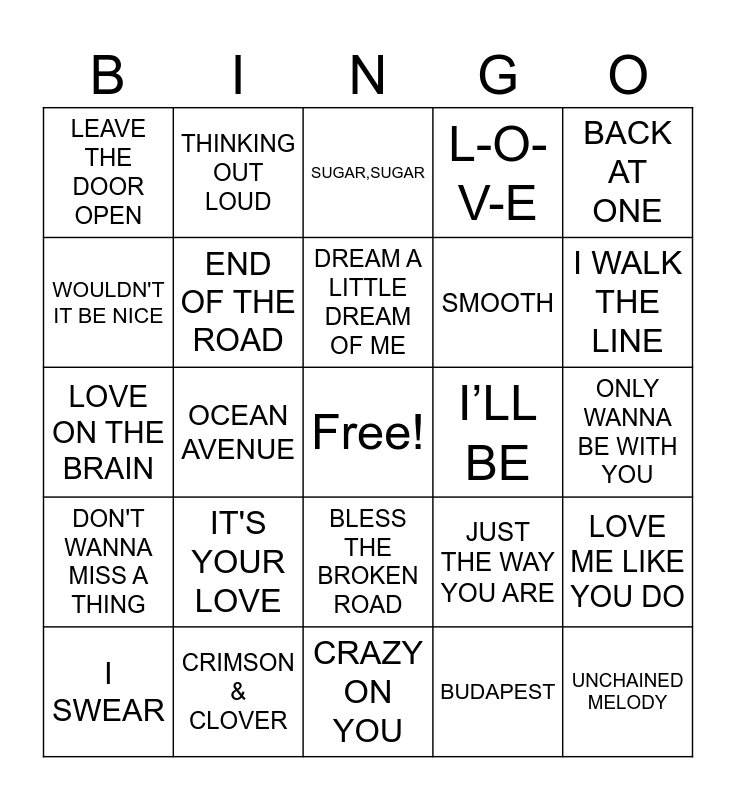 This bingo card has a free space and 24 words: IT'S YOUR LOVE, CRIMSON & CLOVER, DREAM A LITTLE DREAM OF ME, I SWEAR, BACK AT ONE, LEAVE THE DOOR OPEN, WOULDN'T IT BE NICE, THINKING OUT LOUD, I’LL BE, BLESS THE BROKEN ROAD, SMOOTH, LOVE ON THE BRAIN, JUST THE WAY YOU ARE, LOVE ME LIKE YOU DO, END OF THE ROAD, BUDAPEST, ONLY WANNA BE WITH YOU, SUGAR,SUGAR, I WALK THE LINE, OCEAN AVENUE, UNCHAINED MELODY, DON'T WANNA MISS A THING, L-O-V-E and CRAZY ON YOU.