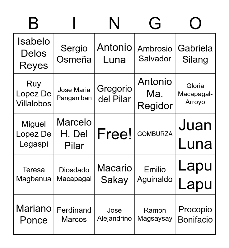 This bingo card has a free space and 55 words: Jose Protasio Rizal Mercado, Mariano Ponce, Graciano Lopez Jaena, Isabelo Delos Reyes, Jose Alejandrino, Pedro Paterno, Jose Maria Panganiban, Ferdinand Blumentritt, Antonio Ma. Regidor, Eduardo De Lete, Ambrosio Salvador, Agustin Dela Rosa, Bonifacio Arevallo, Deodato Arellano, Manuel L. Quezon, Apolinario Mabini, Gabriela Silang, Marcelo H. Del Pilar, Andres Bonifacio, Procopio Bonifacio, GOMBURZA, Melchora Aquino, Emilio Aguinaldo, Antonio Luna, Miguel Malvar, Gregorio del Pilar, Ramon Magsaysay, Emilio Jacinto, Juan Luna, Lapu Lapu, Rajah Humabon, Rajah Matanda, Rajah Sulayman, Ferdinand Magellan, Ruy Lopez De Villalobos, Miguel Lopez De Legaspi, Trinidad Tecson, Teresa Magbanua, Marina Dizon, José P. Laurel, Sergio Osmeña, Manuel Roxas, Elpidio Quirino, Carlos P. Garcia, Diosdado Macapagal, Ferdinand Marcos, Corazon Aquino, Fidel V. Ramos, Joseph Estrada, Gloria Macapagal-Arroyo, Benigno Aquino III, Rodrigo Duterte, Ferdinand "Bongbong" Marcos Jr., Macario Sakay and Sultan Kudarat.