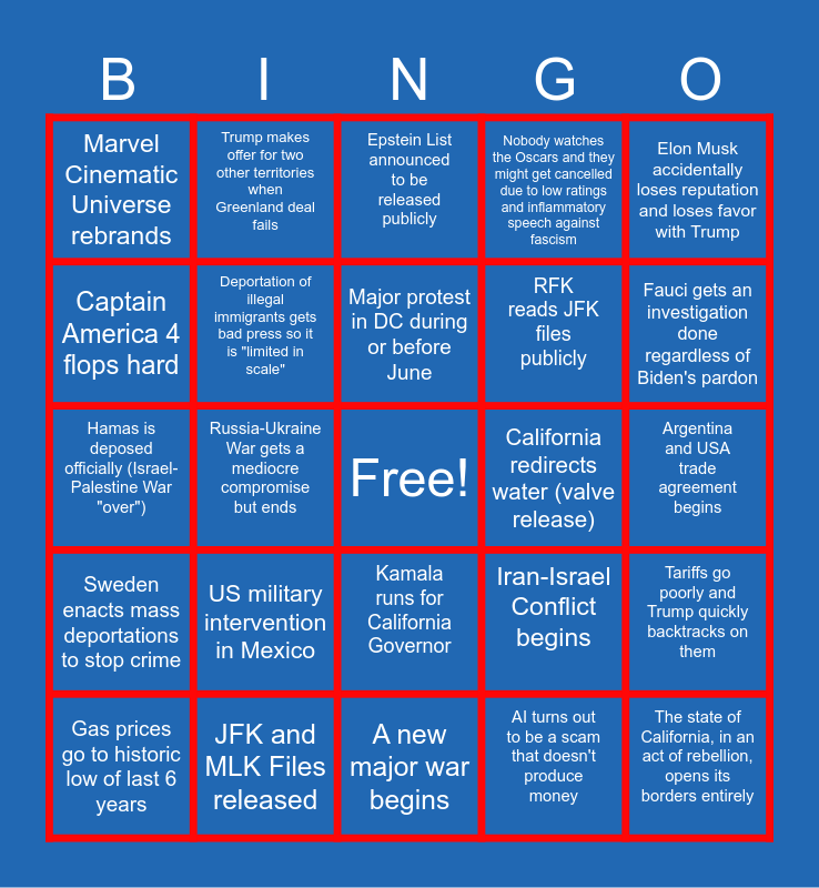 This bingo card has a free space and 24 words: US military intervention in Mexico, JFK and MLK Files released, Major protest in DC during or before June, Gas prices go to historic low of last 6 years, Elon Musk accidentally loses reputation and loses favor with Trump, Marvel Cinematic Universe rebrands, Captain America 4 flops hard, Trump makes offer for two other territories when Greenland deal fails, California redirects water (valve release), Kamala runs for California Governor, RFK reads JFK files publicly, Hamas is deposed officially (Israel-Palestine War "over"), Iran-Israel Conflict begins, Tariffs go poorly and Trump quickly backtracks on them, Deportation of illegal immigrants gets bad press so it is "limited in scale", AI turns out to be a scam that doesn't produce money, Argentina and USA trade agreement begins, Epstein List announced to be released publicly, Fauci gets an investigation done regardless of Biden's pardon, Russia-Ukraine War gets a mediocre compromise but ends, The state of California, in an act of rebellion, opens its borders entirely, Sweden enacts mass deportations to stop crime, Nobody watches the Oscars and they might get cancelled due to low ratings and inflammatory speech against fascism and A new major war begins.