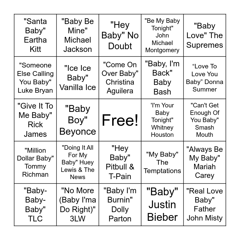 This bingo card has a free space and 32 words: "Baby" Justin Bieber, "...Baby One More Time" Britney Spears, "Baby Boy" Beyonce, "Baby Got Back" Sir Mix-A-Lot, "Million Dollar Baby" Tommy Richman, "Ice Ice Baby" Vanilla Ice, "Baby Love" The Supremes, "Always Be My Baby" Mariah Carey, "Baby Be Mine" Michael Jackson, "I Got You Babe" Sonny & Cher, "Come On Over Baby" Christina Aguilera, "Hey Baby" No Doubt, "Baby" Brandy, "Rock Wit U (Aww Baby)" Ashanti, 'I'm Your Baby Tonight" Whitney Houston, "Industry Baby" Lil Nas X, "Baby-Baby-Baby" TLC, "Give It To Me Baby" Rick James, "Hey Baby" Pitbull & T-Pain, "Doing It All For My Baby" Huey Lewis & The News, "My Baby" The Temptations, "Don't Worry Baby" The Beach Boys, "Can't Get Enough Of You Baby" Smash Mouth, "No More (Baby I'ma Do Right)" 3LW, "Real Love Baby" Father John Misty, "Be My Baby Tonight" John Michael Montgomery, "Baby, I'm Back" Baby Bash, "Someone Else Calling You Baby" Luke Bryan, "Santa Baby" Eartha Kitt, "Baby I'm Burnin" Dolly Parton, "Baby It's Cold Outside" Frank Sinatra and “Love To Love You Baby” Donna Summer.