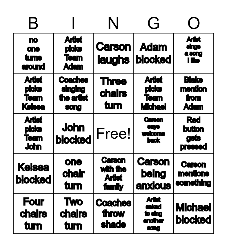 This bingo card has a free space and 24 words: one chair turn, Two chairs turn, Three chairs turn, Four chairs turn, Artist sings a song I like, no one turns around, Artist picks Team Kelsea, Artist picks Team Adam, Carson says welcome back, Carson with the Artist family, Artist picks Team Michael, Artist picks Team John, Carson being anxious, Carson mentions something, Coaches singing the artist song, Artist asked to sing another song, Red button gets pressed, Carson laughs, Blake mention from Adam, John blocked, Michael blocked, Kelsea blocked, Adam blocked and Coaches throw shade.