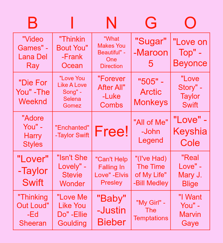 This bingo card has a free space and 34 words: "Die With A Smile" -Lady Gaga & Bruno Mars, "My Girl" -The Temptations, "My Boo" -Usher, "One Call Away" -Charlie Puth, "Lover" -Taylor Swift, "Love You Like A Love Song" -Selena Gomez, "Love on Top" -Beyonce, "Thinking Out Loud" -Ed Sheeran, "Thinkin Bout You" -Frank Ocean, "Intentions" -Justin Bieber, "Forever After All" -Luke Combs, "What Makes You Beautiful" -One Direction, "Chasing After You" -Ryan Hurd & Maren Morris, "Love on the Brain" -Rihanna, "All of Me" -John Legend, "Love Story" -Taylor Swift, "Love Me Like You Do" -Ellie Goulding, "Adore You" -Harry Styles, "Isn't She Lovely" -Stevie Wonder, "(I've Had) The Time of My Life" -Bill Medley, "Can't Help Falling In Love" -Elvis Presley, "Let Me Love You" -Mario, "Video Games" -Lana Del Ray, "Love" -Keyshia Cole, "Baby" -Justin Bieber, "I Want You" -Marvin Gaye, "Sugar" -Maroon 5, "This Love" -Maroon 5, "505" -Arctic Monkeys, "Die For You" -The Weeknd, "Fallin'" -Alicia Keys, "Enchanted" -Taylor Swift, "Real Love" -Mary J. Blige and "Mary You" -Bruno Mars.