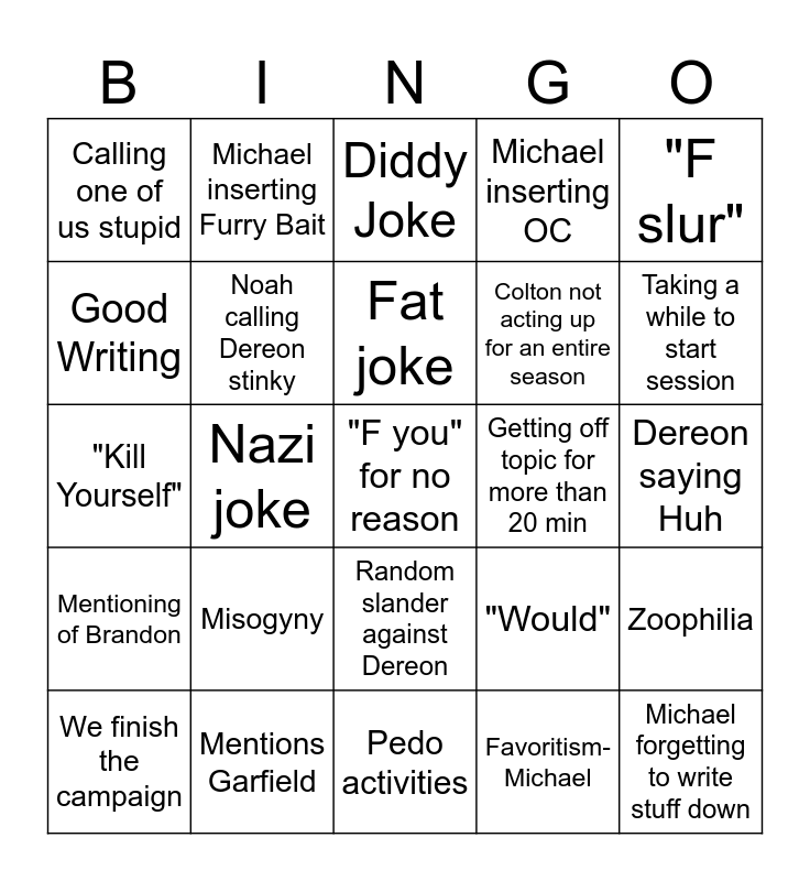 This bingo card has 25 words: Misogyny, Pedo activities, Fat joke, We finish the campaign, "F slur", Calling one of us stupid, Good Writing, Michael inserting Furry Bait, Getting off topic for more than 20 min, Random slander against Dereon, Colton not acting up for an entire season, "Kill Yourself", "Would", Zoophilia, Noah calling Dereon stinky, Michael forgetting to write stuff down, Dereon saying Huh, Diddy Joke, Taking a while to start session, Nazi joke, "F you" for no reason, Mentions Garfield, Mentioning of Brandon, Michael inserting OC and Favoritism- Michael.
