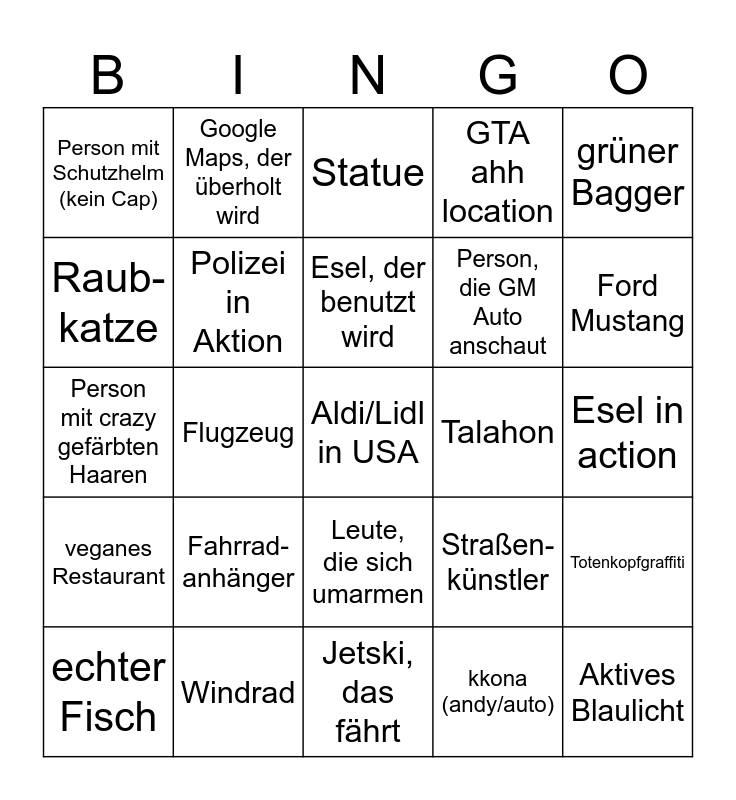 This bingo card has 25 words: Fahrrad-anhänger, Jetski, das fährt, Esel, der benutzt wird, echter Fisch, grüner Bagger, Person mit Schutzhelm (kein Cap), Raub-katze, Google Maps, der überholt wird, Talahon, Leute, die sich umarmen, Person, die GM Auto anschaut, Person mit crazy gefärbten Haaren, Straßen-künstler, Totenkopfgraffiti, Polizei in Aktion, Aktives Blaulicht, Esel in action, Statue, Ford Mustang, Flugzeug, Aldi/Lidl in USA, Windrad, veganes Restaurant, GTA ahh location and kkona (andy/auto).