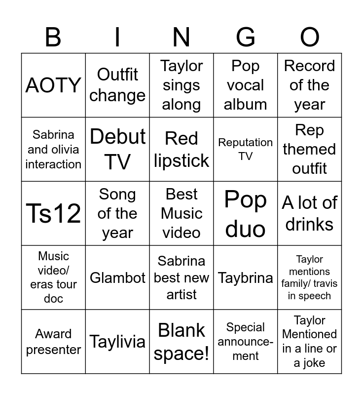 This bingo card has 25 words: Music video/ eras tour doc, Taylivia, Best Music video, Special announce- ment, Record of the year, AOTY, Outfit change, Taylor sings along, Pop duo, Taylor mentions family/ travis in speech, Sabrina and olivia interaction, Debut TV, Blank space!, Taybrina, Rep themed outfit, Award presenter, Song of the year, Red lipstick, Reputation TV, A lot of drinks, Ts12, Glambot, Sabrina best new artist, Pop vocal album and Taylor Mentioned in a line or a joke.