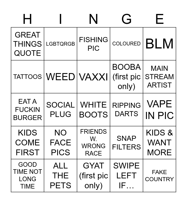 This bingo card has a free space and 24 words: NO FACE PICS, ALL THE PETS, VAXXI, GOOD TIME NOT LONG TIME, BLM, GREAT THINGS QUOTE, TATTOOS, LGBTQRGB, RIPPING DARTS, FRIENDS W. WRONG RACE, BOOBA (first pic only), EAT A FUCKIN BURGER, SNAP FILTERS, KIDS & WANT MORE, WEED, SWIPE LEFT IF…, VAPE IN PIC, FISHING PIC, MAIN STREAM ARTIST, SOCIAL PLUG, FAKE COUNTRY, KIDS COME FIRST, COLOURED and GYAT (first pic only).