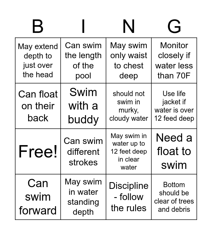 This bingo card has 20 words: Need a float to swim, Need a parent in the water, May swim only waist to chest deep, Should be enclosed in physical boundaries, Can swim forward, Can float on their back, May swim in water standing depth, May extend depth to just over the head, Free!, Can swim the length of the pool, Can swim different strokes, May swim in water up to 12 feet deep in clear water, Swim with a buddy, Bottom should be clear of trees and debris, should not swim in murky, cloudy water, Wait 30 minutes after lightning, Use life jacket if water is over 12 feed deep, Monitor closely if water less than 70F, Discipline - follow the rules and Protects themselves against the sun.