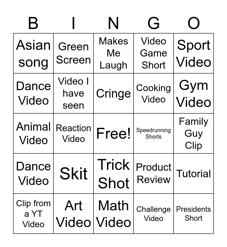 This bingo card has a free space and 24 words: Skit, Art Video, Cringe, Clip from a YT Video, Sport Video, Asian song, Dance Video, Green Screen, Speedrunning Shorts, Trick Shot, Cooking Video, Animal Video, Product Review, Tutorial, Video I have seen, Challenge Video, Family Guy Clip, Makes Me Laugh, Gym Video, Reaction Video, Presidents Short, Dance Video, Video Game Short and Math Video.