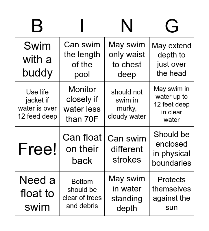 This bingo card has 20 words: Need a float to swim, Need a parent in the water, May swim only waist to chest deep, Should be enclosed in physical boundaries, Can swim forward, Can float on their back, May swim in water standing depth, May extend depth to just over the head, Free!, Can swim the length of the pool, Can swim different strokes, May swim in water up to 12 feet deep in clear water, Swim with a buddy, Bottom should be clear of trees and debris, should not swim in murky, cloudy water, Wait 30 minutes after lightning, Use life jacket if water is over 12 feed deep, Monitor closely if water less than 70F, Discipline - follow the rules and Protects themselves against the sun.