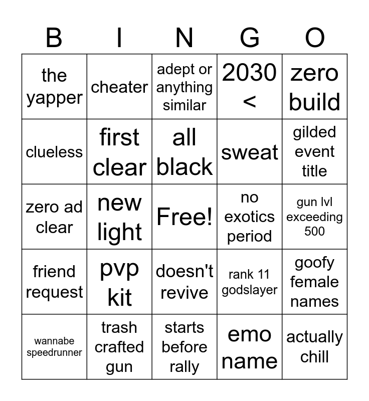 This bingo card has a free space and 24 words: pvp kit, trash crafted gun, all black, wannabe speedrunner, zero build, the yapper, clueless, cheater, no exotics period, doesn't revive, sweat, zero ad clear, rank 11 godslayer, goofy female names, first clear, emo name, gun lvl exceeding 500, adept or anything similar, gilded event title, new light, actually chill, friend request, 2030 < and starts before rally.