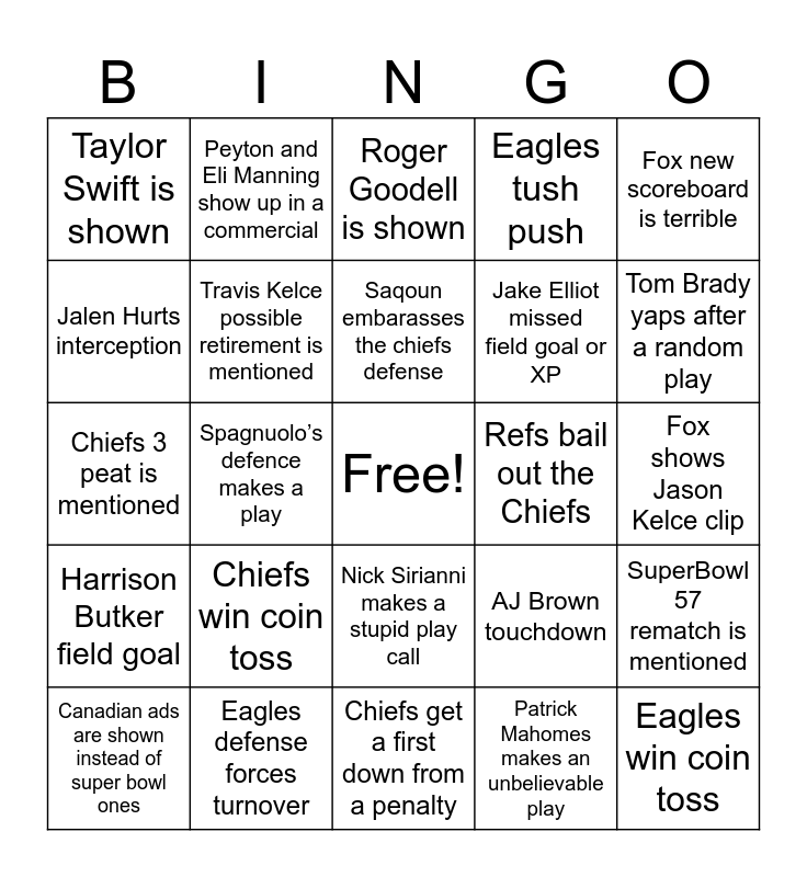 This bingo card has a free space and 24 words: Chiefs win coin toss, Eagles defense forces turnover, Saqoun embarasses the chiefs defense, Canadian ads are shown instead of super bowl ones, Fox new scoreboard is terrible, Taylor Swift is shown, Jalen Hurts interception, Peyton and Eli Manning show up in a commercial, Refs bail out the Chiefs, Nick Sirianni makes a stupid play call, Jake Elliot missed field goal or XP, Chiefs 3 peat is mentioned, AJ Brown touchdown, SuperBowl 57 rematch is mentioned, Travis Kelce possible retirement is mentioned, Patrick Mahomes makes an unbelievable play, Fox shows Jason Kelce clip, Roger Goodell is shown, Tom Brady yaps after a random play, Spagnuolo’s defence makes a play, Eagles win coin toss, Harrison Butker field goal, Eagles tush push and Chiefs get a first down from a penalty.