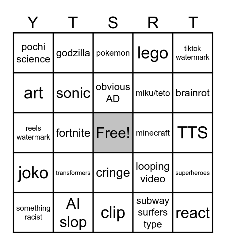 This bingo card has a free space and 29 words: something racist, something sexist, fortnite, camman18, pochi science, pokemon, sonic, transformers, minecraft, AI slop, TTS, react, clip, subway surfers type, brainrot, rizz, cringe, joko, tiktok watermark, reels watermark, looping video, cooking, miku/teto, art, lego, godzilla, superheroes, obvious AD and reddit reading.