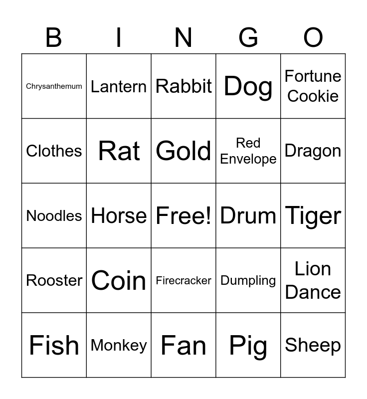 This bingo card has a free space and 25 words: Coin, Fan, Gold, Fish, Fortune Cookie, Chrysanthemum, Clothes, Lantern, Drum, Firecracker, Red Envelope, Noodles, Dumpling, Lion Dance, Rat, Ox, Tiger, Rabbit, Dragon, Horse, Sheep, Monkey, Rooster, Dog and Pig.