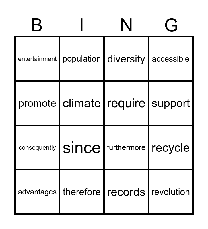 This bingo card has 33 words: study, setback, recycle, environment, revolution, require, promote, gender, population, waste, support, diversity, inequality, supply, therefore, since, as a result, furthermore, complexity, excluding, magnificent, exhibition, entertainment, records, in addition, advantages, accessible, consequently, climate, prevent, decrease, nevertheless and whereas.