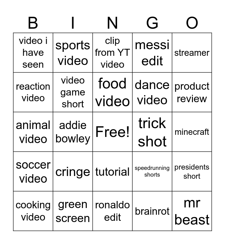 This bingo card has a free space and 24 words: cringe, green screen, food video, cooking video, streamer, video i have seen, reaction video, sports video, trick shot, tutorial, dance video, animal video, speedrunning shorts, presidents short, video game short, brainrot, minecraft, clip from YT video, product review, addie bowley, mr beast, soccer video, messi edit and ronaldo edit.
