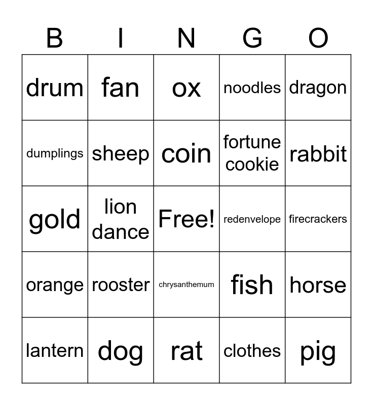 This bingo card has a free space and 26 words: chrysanthemum, clothes, coin, dog, dragon, drum, dumplings, fan, firecrackers, fish, fortune cookie, gold, horse, lantern, lion dance, monkey, noodles, orange, ox, pig, rabbit, rat, redenvelope, rooster, sheep and tiger.