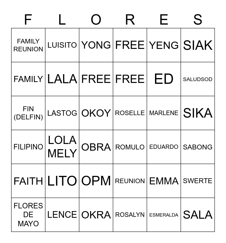This bingo card has 60 words: FLORES, LOLA MELY, MARLON, ROMULO, ESMERALDA, SEBIO, FAMILY, LOLO SEBIO, YONG, ROSALYN, ED, SEALTIEL, FAMILY REUNION, LITO, FREE, FREE, EDUARDO, SIAK, FRANCISCA, LUISITO, FREE, FREE, EMMA, SIKA, FRANCIS, LENCE, OPM, ROY, MARLENE, SALA, FLOYD, LAWRENCE, OONG, RVEE, YENG, SABONG, FAITH, LALA, OKRA, ROSELLE, ENGINEER, SALUDSOD, FIN (DELFIN), LOREN, OKOY, REUNION, EMBUTIDO, SIDA, FLORES DE MAYO, LASTOG, OBRA, RUAR, EMPERADOR, SWERTE, FILIPINO, LUGAN, OCAMPO, RAGSAK, EUGENIO and SARANAY.