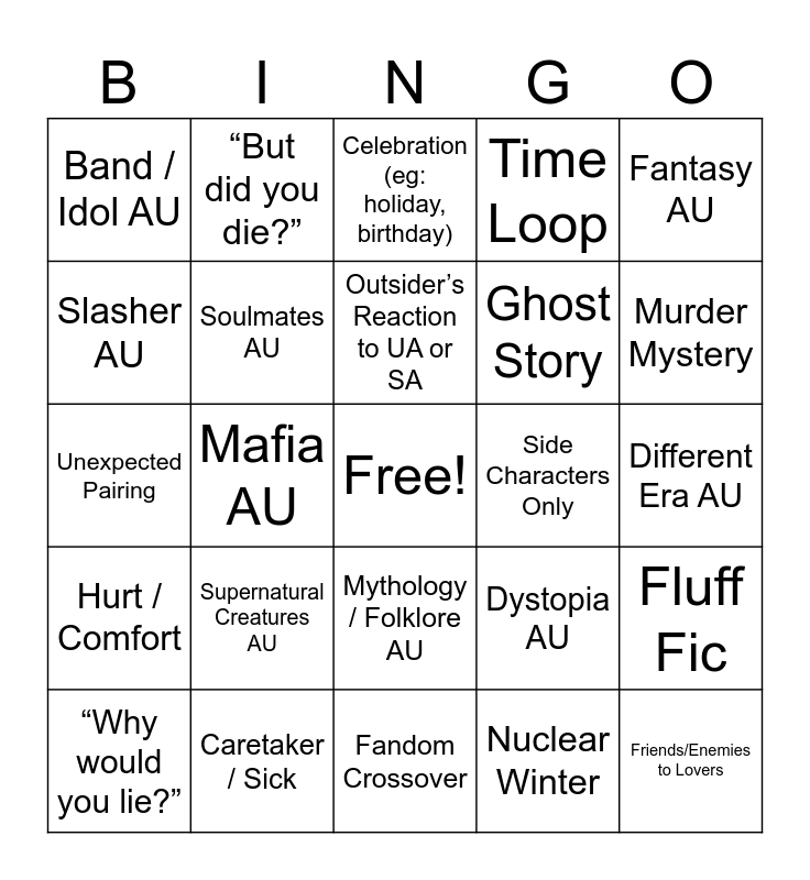 This bingo card has a free space and 34 words: AI causes the Apocalypse, Nuclear Winter, World War III, Science Gone Wrong, Hurt / Comfort, Soulmates AU, Fantasy AU, “Why would you lie?”, “But did you die?”, Power Swap, Outsider’s Reaction to UA or SA, Celebration (eg: holiday, birthday), College AU, Coffee Shop / Bookstore AU, Side Characters Only, Murder Mystery, Caretaker / Sick, Unexpected Pairing, Supernatural Creatures AU, Dystopia AU, Mythology / Folklore AU, Horror AU, Band / Idol AU, Different Era AU, Fandom Crossover, Friends/Enemies to Lovers, Time Loop, Accidental Child Acquisition, Ghost Story, Slasher AU, Game Show AU, Mafia AU, Fluff Fic and Favorite Ship.
