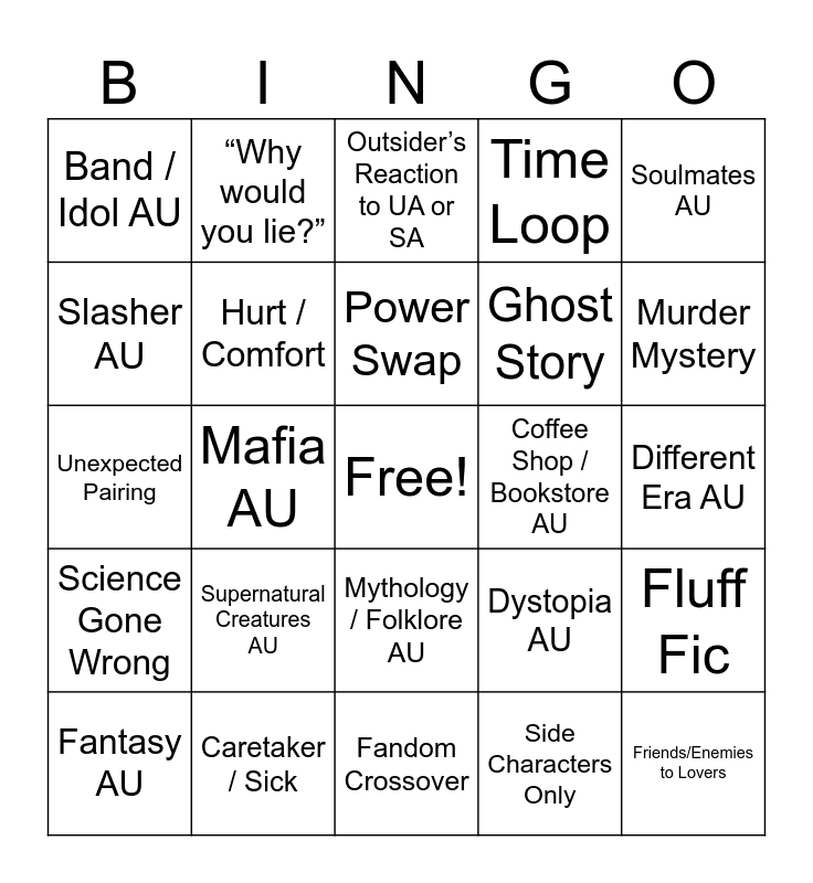 This bingo card has a free space and 34 words: AI causes the Apocalypse, Side Characters Only, Nuclear Winter, World War III, Science Gone Wrong, Hurt / Comfort, Soulmates AU, Fantasy AU, “Why would you lie?”, “But did you die?”, Power Swap, Outsider’s Reaction to UA or SA, Celebration (eg: holiday, birthday), College AU, Coffee Shop / Bookstore AU, Murder Mystery, Caretaker / Sick, Unexpected Pairing, Supernatural Creatures AU, Dystopia AU, Mythology / Folklore AU, Horror AU, Band / Idol AU, Different Era AU, Fandom Crossover, Friends/Enemies to Lovers, Time Loop, Accidental Child Acquisition, Ghost Story, Slasher AU, Game Show AU, Mafia AU, Fluff Fic and Favorite Ship.