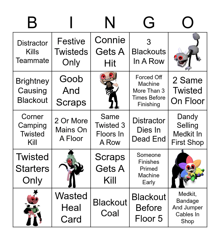 This bingo card has 7 images and 30 words: Unintentional Dandy's Run (Terrible Shops), Dandy Selling 1 Item, Brightney And Rudie, Goob And Scraps, 2 Or More Mains On A Floor, 3 Blackouts In A Row, Same Twisted 3 Floors In A Row, Dandy Selling Medkit In First Shop, Brightney Causing Blackout, Twisted Starters Only, Goob Gets A Kill, Connie Gets A Hit, Scraps Gets A Kill, Distractor Dies In Dead End, Distractor Kills Teammate, 2 Same Twisted On Floor, Blackout Coal, Main Before Floor 10, Blackout Before Floor 5, Festive Twisteds Only, Free Floor, Death Floor 1, Razzle And Dazzle Gets A Hit, Beat Floor 20, Wasted Heal Card, Corner Camping Twisted Kill, Medkit, Bandage And Jumper Cables In Shop, Someone Finishes Primed Machine Early, Forced Off Machine More Than 3 Times Before Finishing and Silent Teammates.