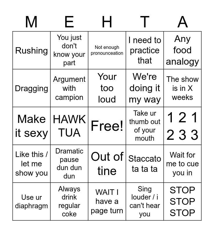 This bingo card has a free space and 24 words: Dramatic pause dun dun dun, Always drink regular coke, Your too loud, Use ur diaphragm, Any food analogy, Rushing, Dragging, You just don't know your part, Take ur thumb out of your mouth, Out of tine, We're doing it my way, Make it sexy, Staccato ta ta ta, Wait for me to cue you in, Argument with campion, Sing louder / i can't hear you, 1 2 1 2 3 3, Not enough pronounceation, The show is in X weeks, HAWK TUA, STOP STOP STOP, Like this / let me show you, I need to practice that and WAIT I have a page turn.