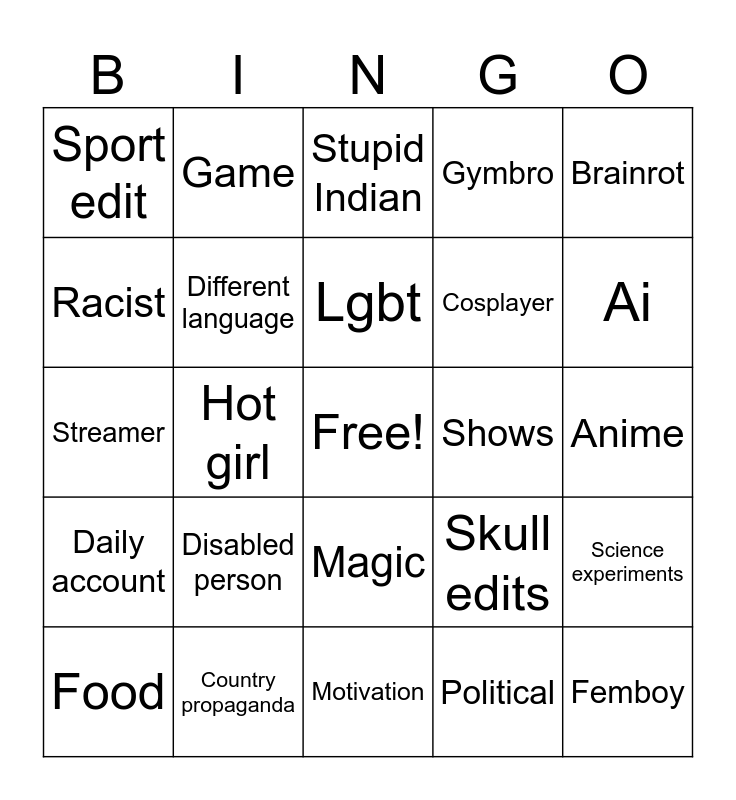 This bingo card has a free space and 24 words: Disabled person, Country propaganda, Lgbt, Food, Brainrot, Sport edit, Racist, Game, Shows, Magic, Cosplayer, Streamer, Skull edits, Science experiments, Different language, Political, Anime, Stupid Indian, Ai, Hot girl, Femboy, Daily account, Gymbro and Motivation.