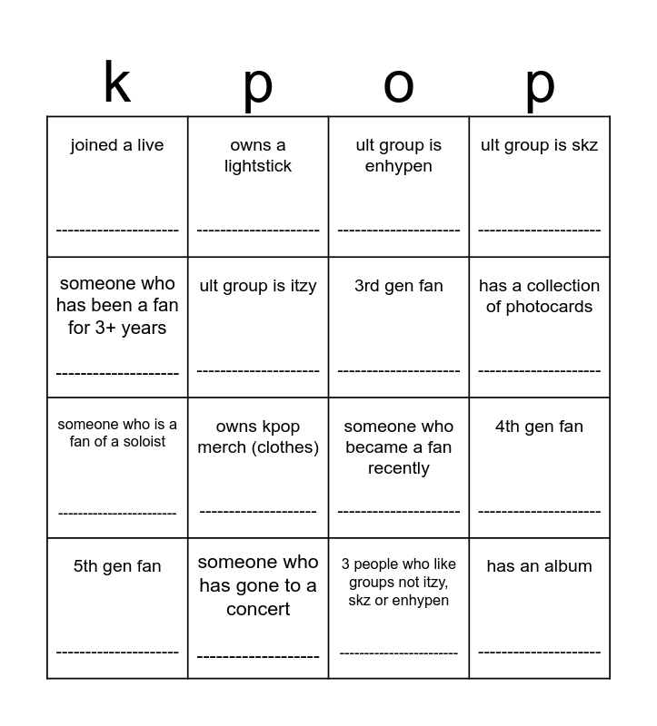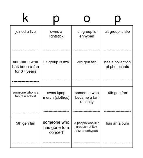 This bingo card has 16 words: someone who has gone to a concert -------------------, 4th gen fan ---------------------, ult group is enhypen ---------------------, joined a live ---------------------, someone who is a fan of a soloist ------------------------, owns a lightstick ---------------------, someone who became a fan recently ---------------------, 3 people who like groups not itzy, skz or enhypen ------------------------, someone who has been a fan for 3+ years --------------------, ult group is itzy ---------------------, 5th gen fan ---------------------, ult group is skz ---------------------, owns kpop merch (clothes) --------------------, has a collection of photocards ---------------------, 3rd gen fan --------------------- and has an album ---------------------.