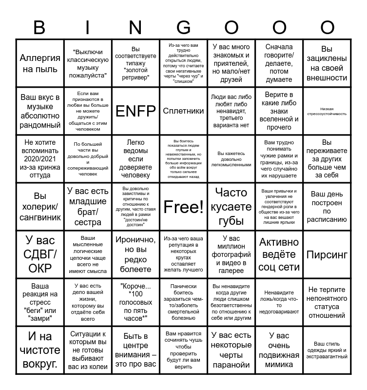 This bingo card has a free space and 48 words: У вас СДВГ/ОКР, У вас есть младшие брат/сестра, Быть в центре внимания – это про вас, Из-за чего ваша репутация в некоторых кругах оставляет желать лучшего, Люди вас либо любят либо ненавидят, третьего варианта нет, Ваши привычки и увлечения не соответствуют гендерной роли в обществе из-за чего на вас вешают лишние ярлыки, Вы зациклены на своей внешности, И на чистоте вокруг., По большей части вы довольно добрый и сопереживающий человек, Вы довольно завистливы и критичны по отношению к другим, часто ставя людей в рамки "достоин/не достоин", Из-за чего вам трудно действительно открыться людям, потому что считаете свои негативныхе черты "через чур" и "слишком", У вас много знакомых и приятелей, но мало/нет друзей, Вам трудно понимать чужие рамки и границы, из-за чего случайно их нарушаете, Вы переживаете за других больше чем за себя, Вы холерик/сангвиник, У вас есть дело вашей жизни, которому вы отдаёте себя всего, Вы соответствуете типажу "золотой ретривер", Вы боитесь показаться людям глупым и невежественным, но попытки запомнить больше информации обо всём вокруг только сильнее откидывают назад, Вы ненавидите когда другие люди слишком безответственны по отношению к себе или другим, Сначала говорите/делаете, потом думаете, Низкая стрессоустойчивость, Ваш вкус в музыке абсолютно рандомный, "Выключи классическую музыку пожалуйста", ENFP, У вас есть некоторые черты паранойи, Верите в какие либо знаки вселенной и прочего, Ваш день построен по расписанию, Ваша реакция на стресс "беги" или "замри", Ваши мысленные логические цепочки чаще всего не имеют смысла, Легко ведомы если доверяете человеку, Панически боитесь заразиться чем-то/заболеть смертельной болезнью, Вы кажетесь довольно легкомысленными, Ненавидите ложь/когда что-то недоговаривают, Не терпите непонятного статуса отношений, Аллергия на пыль, Ситуации к которым вы не готовы выбивают вас из колеи, Иронично, но вы редко болеете, Вам нравится сочинять чушь чтобы проверить будут ли вам верить, Часто кусаете губы, У вас очень подвижная мимика, Пирсинг, Не хотите вспоминать 2020/2021 из-за кринжа оттуда, Если вам признаются в любви вы больше не можете дружить/общаться с этим человеком, "Короче... *100 голосовых по пять часов*", Сплетники, У вас миллион фотографий и видео в галерее, Активно ведёте соц сети and Ваш стиль одежды яркий и экстравагантный.