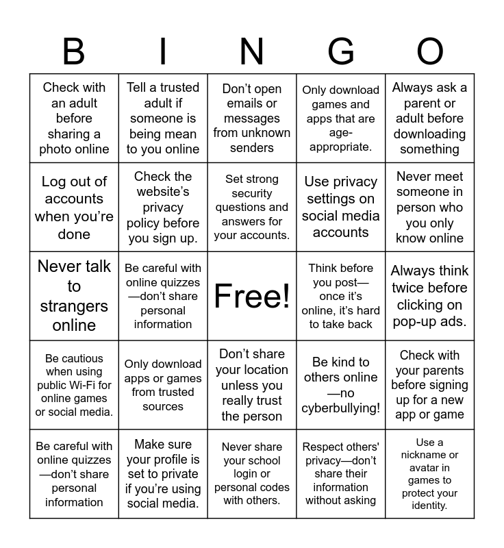 This bingo card has a free space and 34 words: Don’t share your password with anyone, Respect others' privacy—don’t share their information without asking, Keep your devices locked and safe from others, Don’t share personal details like your full name, address, or school, Be cautious when using public Wi-Fi for online games or social media., Check the website’s privacy policy before you sign up., Always ask a parent or adult before downloading something, Be careful with online quizzes—don’t share personal information, Tell a trusted adult if someone is being mean to you online, Report any online behavior that makes you feel uncomfortable, Set strong security questions and answers for your accounts., Don’t open emails or messages from unknown senders, Don’t share your email or phone number unless you trust the person., Check with your parents before signing up for a new app or game, Think before you post—once it’s online, it’s hard to take back, Never meet someone in person who you only know online, Make sure your profile is set to private if you’re using social media., Never talk to strangers online, Only download apps or games from trusted sources, Be kind to others online—no cyberbullying!, Don’t share your location unless you really trust the person, Tell an adult if you see something inappropriate online, Check with an adult before sharing a photo online, Always think twice before clicking on pop-up ads., Never share your school login or personal codes with others., Use a nickname or avatar in games to protect your identity., Only download games and apps that are age-appropriate., Respect others’ opinions and avoid arguing online., Use privacy settings on social media accounts, Log out of accounts when you’re done, Only add people you know in real life as friends online, Be careful with online quizzes—don’t share personal information, Check with your parents before signing up for a new app or game and Think about how your online actions might affect others.