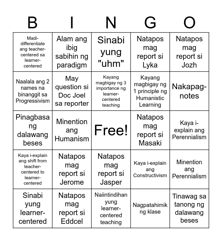 This bingo card has a free space and 43 words: Tinawag sa tanong ng isang beses, Tinawag sa tanong ng dalawang beses, Tinawag sa tanong ng tatlong beses, Sinabi yung learner-centered, Sinabi yung teacher-centered, Nagpatahimik ng klase, Sinabi yung "uhm", Natapos mag report si Aly, Natapos mag report si Jozh, Natapos mag report si Eddcel, Natapos mag report si Lyka, Natapos mag report si Masaki, Natapos mag report si Jasper, Natapos mag report si Jerome, Natapos mag report si Raihana, Naiintindihan yung learner-centered teaching, Pinagbasa ng isang beses, Pinagbasa ng dalawang beses, Pinagbasa ng tatlong beses, Nakapag-notes, Alam ang ibig sabihin ng paradigm, Alam ang pronunciation ng paradigm, Kayang ibigay yung definition ng teacher-centered, Madi-differentiate ang teacher-centered sa learner-centered, Kaya i-explain ang Essentialism, Kaya i-explain ang Perennialism, Kaya i-explain ang Progressivism, Kaya i-explain ang Humanism, Kaya i-explain ang Constructivism, Kaya i-explain ang shift from teacher-centered to learner-centered, Minention ang Essentialism, Minention ang Perennialism, Minention ang Progressivism, Minention ang Humanism, Minention ang Constructivism, Kayang magbigay ng 1 importance ng learner-centered teaching, Kayang magbigay ng 2 importance ng learner-centered teaching, Kayang magbigay ng 3 importance ng learner-centered teaching, Naalala ang 2 names na binanggit sa Progressivism, Kayang magbigay ng 1 principle ng Humanistic Learning, Kayang magbigay ng 1 type ng constructivism, May question si Doc Joel sa reporter and Tinawag si Lubuguin.