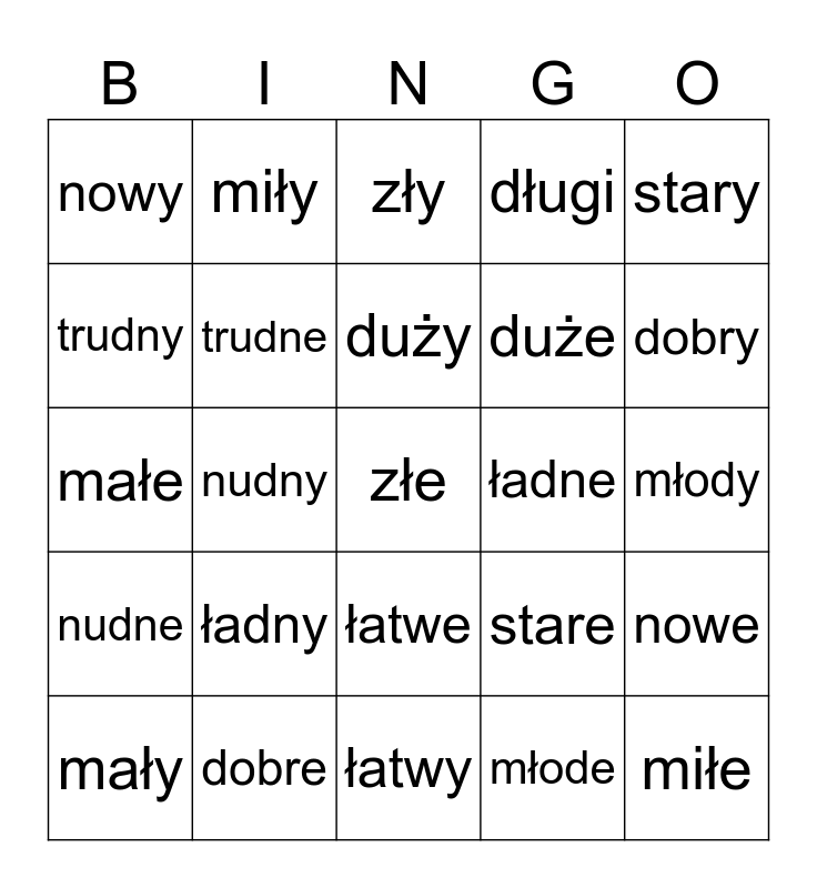 This bingo card has 25 words: ładny, łatwy, duży, mały, stary, nowy, trudny, miły, ładne, łatwe, duże, małe, stare, nowe, trudne, miłe, młody, zły, dobry, nudny, złe, dobre, nudne, długi and młode.