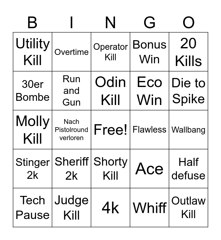 This bingo card has a free space and 24 words: Sheriff 2k, Judge Kill, Odin Kill, Tech Pause, 20 Kills, Utility Kill, 30er Bombe, Overtime, Flawless, Shorty Kill, Eco Win, Molly Kill, Ace, Half defuse, Run and Gun, Whiff, Wallbang, Operator Kill, Die to Spike, Nach Pistolround verloren, Outlaw Kill, Stinger 2k, Bonus Win and 4k.