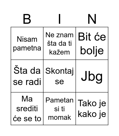 This bingo card has a free space and 8 words: Jbg, Bit će bolje, Ne znam šta da ti kažem, Ma srediti će se to, Nisam pametna, Tako je kako je, Šta da se radi and Pametan si ti momak.