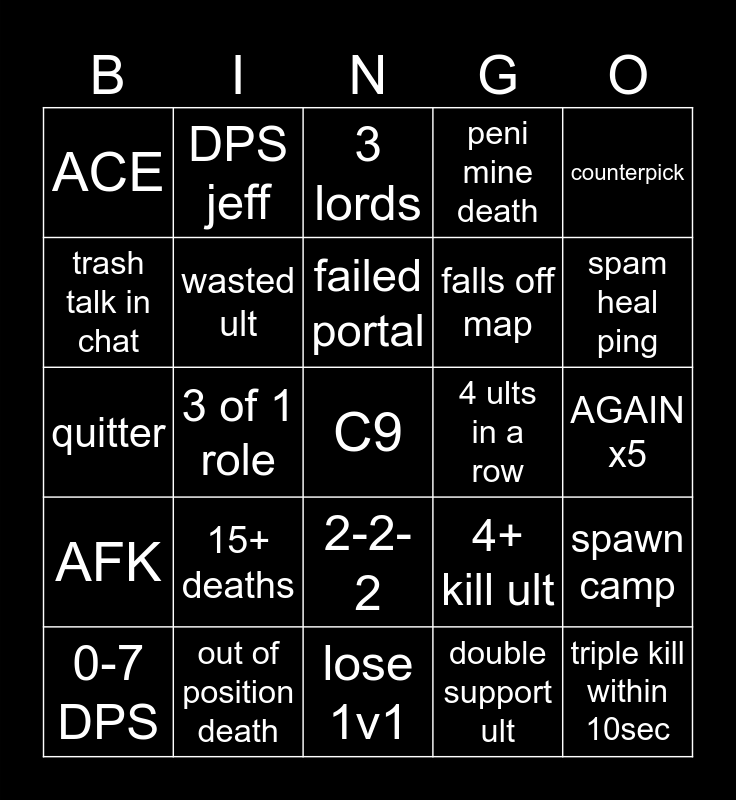 This bingo card has a free space and 29 words: 0-7 DPS, 30% or less accuracy, 3 of 1 role, ult cancel, ACE, 3 lords, wasted ult, 15+ deaths, 4 ults in a row, out of position death, AGAIN x5, triple kill within 10sec, lose 1v1, double support ult, spam heal ping, MVP, 2-2-2, AFK, counterpick, quitter, 4+ kill ult, 30+ kills, falls off map, trash talk in chat, peni mine death, DPS jeff, spawn camp, failed portal and CC'd twice in a row.