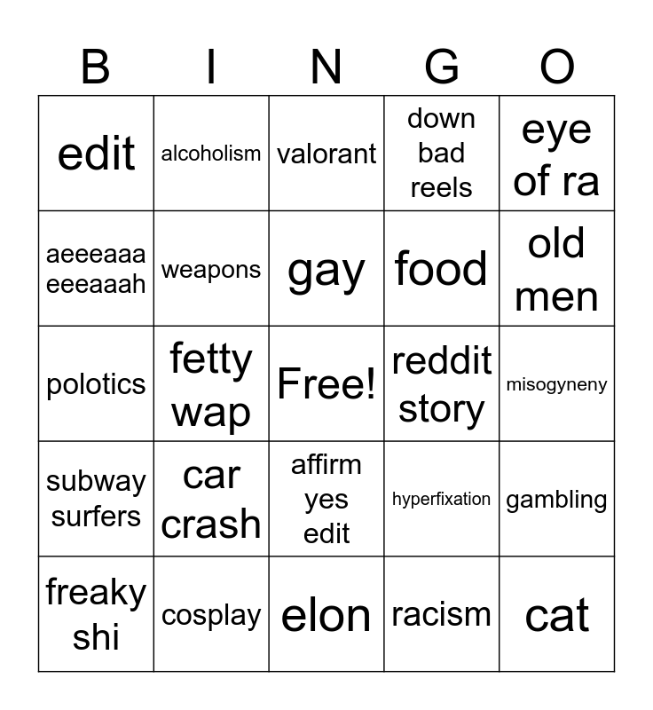 This bingo card has a free space and 24 words: car crash, cosplay, gay, freaky shi, eye of ra, edit, aeeeaaa eeeaaah, alcoholism, reddit story, affirm yes edit, food, polotics, hyperfixation, gambling, weapons, racism, misogyneny, valorant, old men, fetty wap, cat, subway surfers, down bad reels and elon.