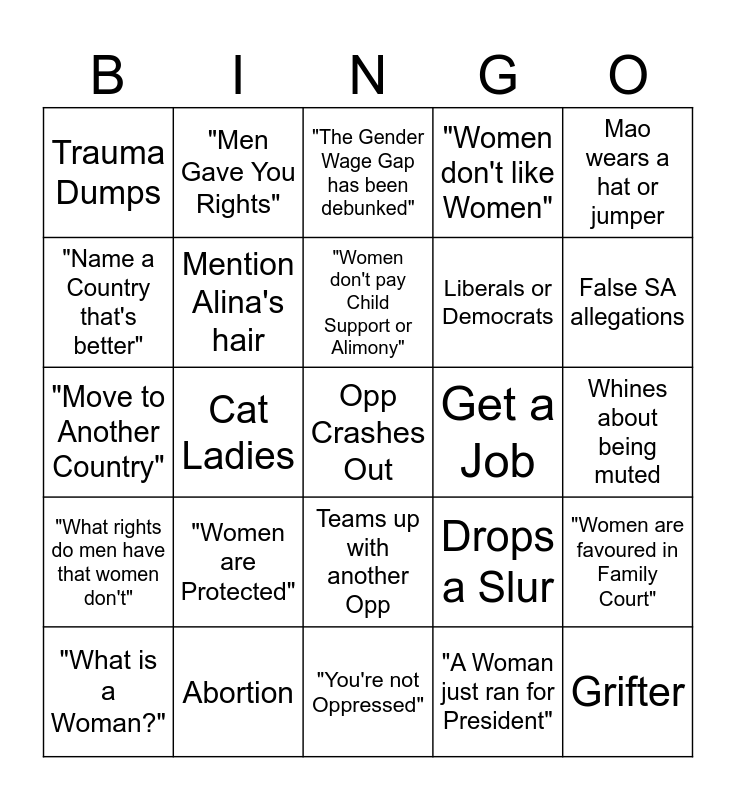 This bingo card has a free space and 33 words: "Females", Transphobia, Cat Ladies, The Draft, "What rights do men have that women don't", Mention Alina's hair, Mao wears a hat or jumper, "What is a Woman?", "Men Gave You Rights", Middle East, "Women don't pay Child Support or Alimony", "The Gender Wage Gap has been debunked", Victim Mentality, "Why don't companies hire all Women?", Get a Job, False SA allegations, Abortion, "Move to Another Country", "Women are Protected", Drops a Slur, Teams up with another Opp, "Women take lower paying Jobs", Trauma Dumps, Whines about being muted, "You're not Oppressed", Grifter, "Women don't like Women", Liberals or Democrats, "Name a Country that's better", "Women are favoured in Family Court", Misandry, "A Woman just ran for President" and DP.